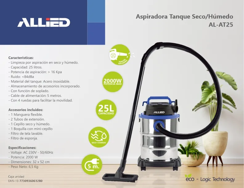 Accesorios incluidos: 1 manguera flexible, 2 tubos de extensión, 1 cepillo seco y húmedo, 1 boquilla con mini-cepillo, filtro de tela lavable, filtro de esponja.