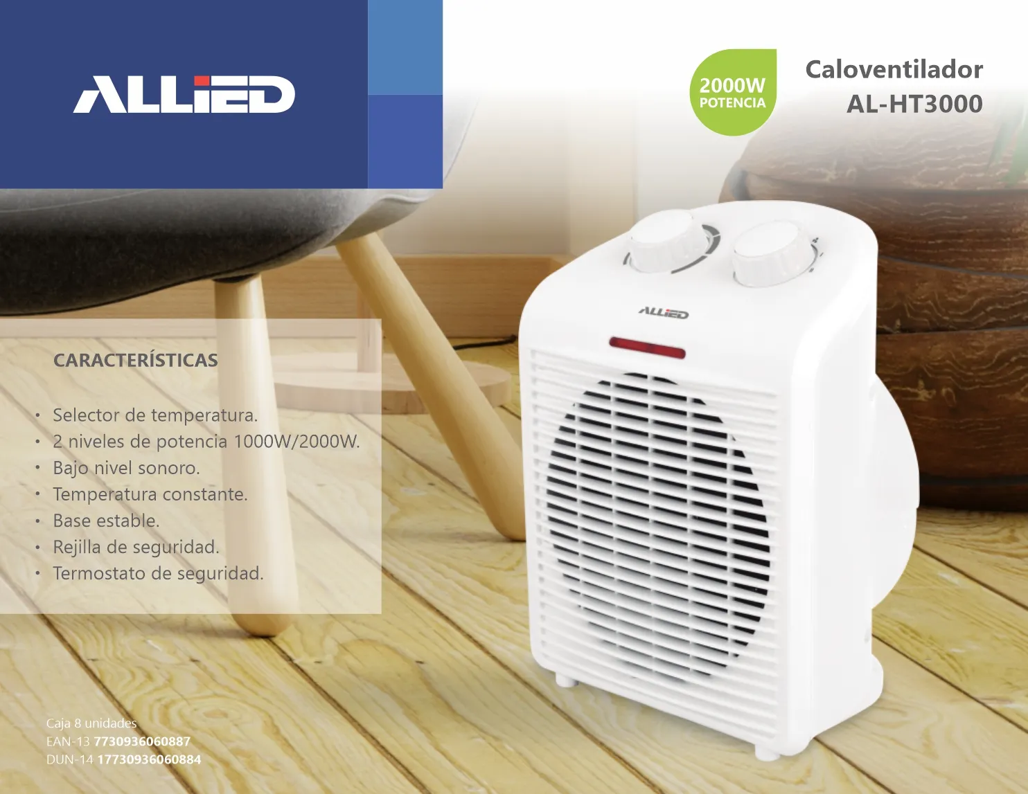 2 niveles de potencia 1000W/2000W.