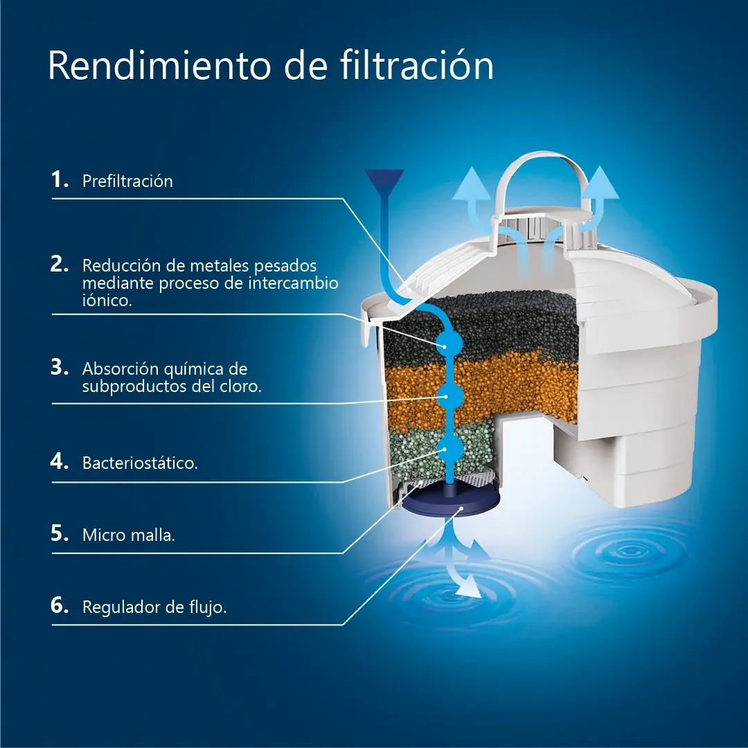 Bi-Flux Filtro de agua F0M LAICA 30 días Facilidad y comodidad: agua siempre disponible para preparar tus comidas y bebidas frías y calientes. No es necesario cargar con botellas pesadas. Económico: el agua filtrada con cartuchos y jarras Laica cuesta solo unos céntimos de euro por litro. Un cartucho Laica equivale a 1 mes de agua filtrada (máximo 150 l). Sabor: el agua filtrada mejora considerablemente el sabor y el aspecto de los alimentos y las bebidas frías o calientes. Respetuoso con el medio ambiente: reduce drásticamente los residuos de botellas de plástico.