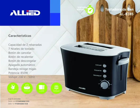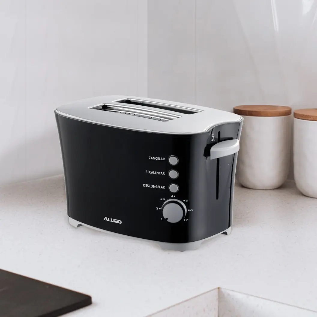 Capacidad de 2 rebanadas. 7 niveles de tostado. Botón de cancelar. Botón de recalentar.